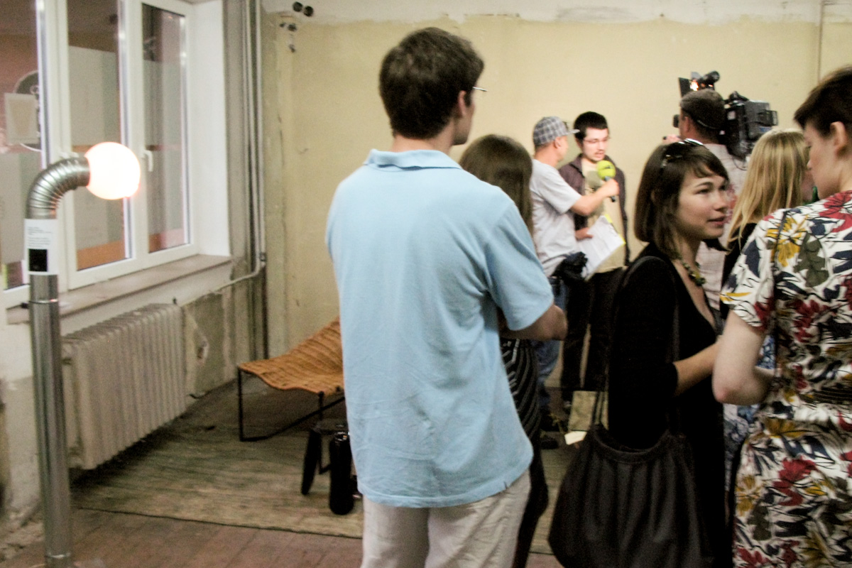 WSZ rozmawia z Protem Haładajem, widzimy plecy Jeremiego Nagrabeckiego – autora lampy OKO