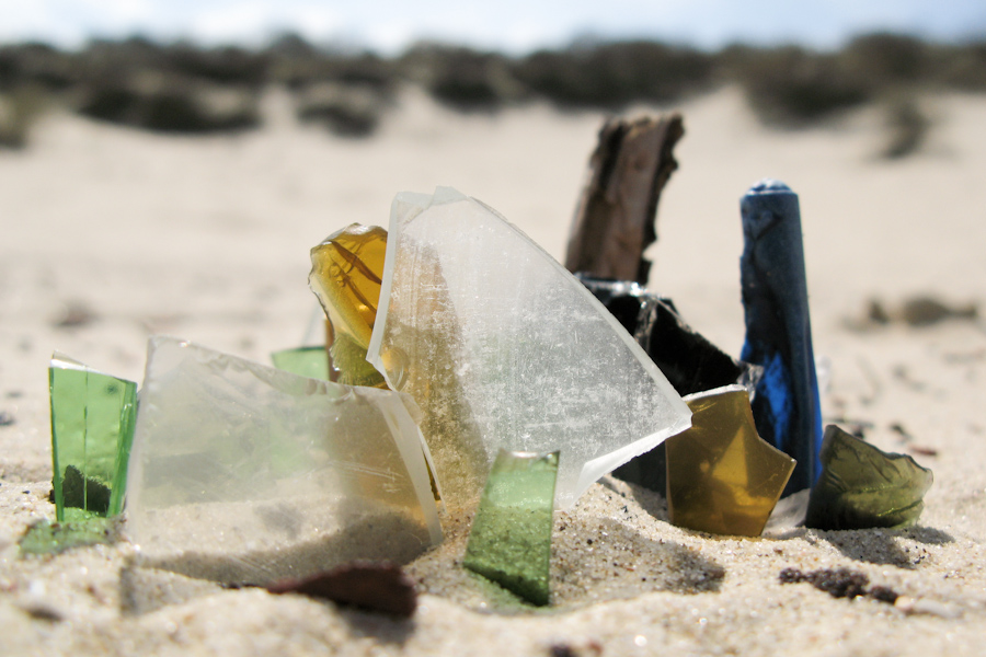 Collection of glass on a dune in Het Zwin, West Flanders, Belgium